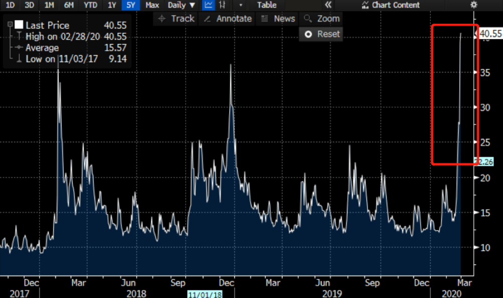 (VIX指数迅速上涨,超过前期高点 来源:Bloomberg)