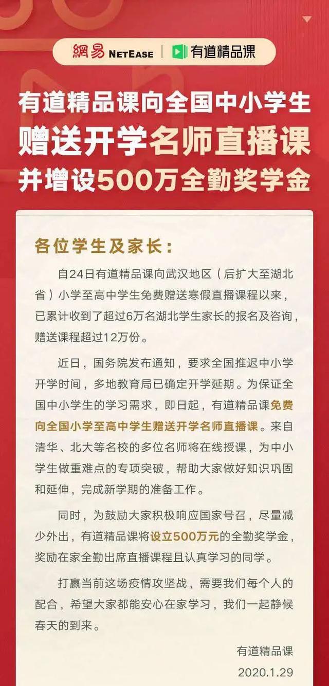 “1月22日,疫情越来越严重,武汉要求中小学暂停寒假期间各类教学活动,看到这些,我们也希望从自身擅长的方向出发,响应国家号召,做一些力所能及的事。”网易有道副总裁刘韧磊对《三声》说,“另一方面,虽然大家需要尽可能少出门,但大量用户还是有学习需求的。”