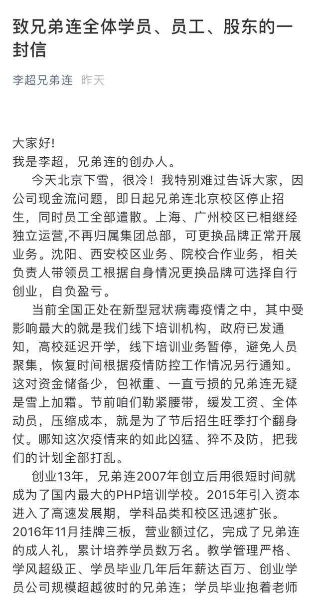 承担着巨大的运维成本和现金流压力,一些教育机构已经因此进入最后的自救,甚至关闭。2月6日,已经成立13年的IT成人培训机构兄弟连创始人李超发布公开信,称因公司现金流问题,北京校区停止招生,该校区员工全部遣散。