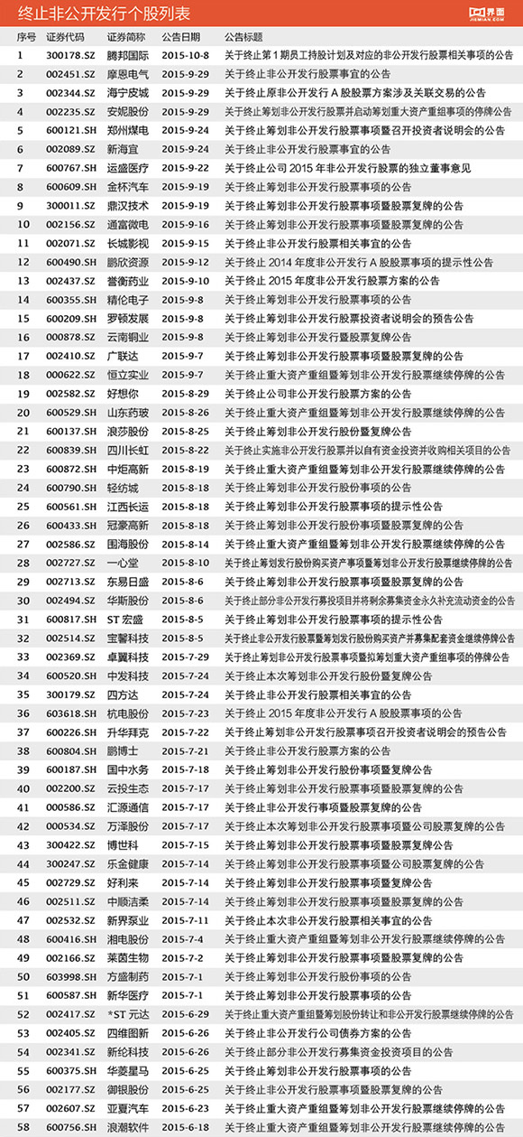 但A股从6月中旬开始,连续跌入低谷,之前信心满满的上市公司开始出现各种融资问题被迫终止定增计划。不少上市公司称因监管政策 变动、或自身增发出现问题等基本因素外,大部分上市公司均表示是因资本市场大幅波动存在不确定因素而终止增发。
