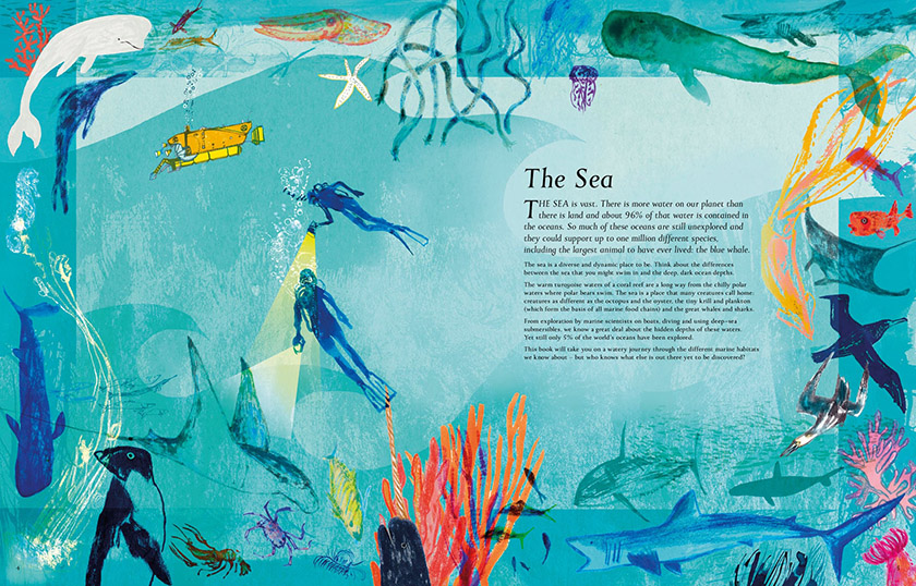 先撇开霍尔不谈,我还是对某些非虚构类环保新书沉重的文风不以为然。就以米兰达·克列斯托夫尼柯甫的《海洋》为例吧(虽然把她这样拎出来有些不公平),这本书告诉我们,海藻能够长到30米长。但这放到现实生活中是多长呢?孩子要怎么去消化这个数据呢?但我的观点无关紧要。我的孩子是怎么评价《海洋》的呢?埃斯梅哭着读完海洋塑料垃圾的内容后,自己翻到水獭的故事寻找安慰去了。“每个人都该试着读读这本书,”她说,“开头可能会让你觉得‘有什么大不了的’,但你能学到很多东西。这本书很棒。”