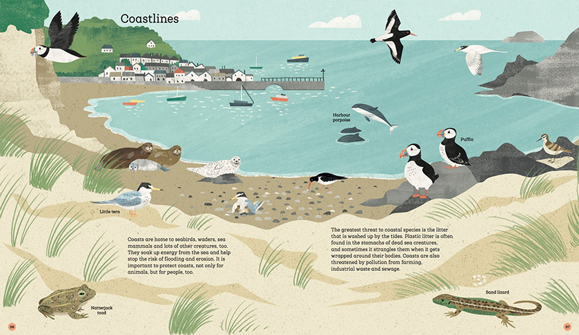 杰基·莫里斯(Jackie Morris)画的野生动物的日常和罗伯特·麦克法兰(Robert Macfarlane)发明的“魔咒”基本组成了大部头绘本《未说出口的话》(The Lost Words)的全部内容,我的孩子们非常喜欢念叨书里的咒语。这本书的大获成功可以说是实至名归,但打那以后,各种以自然和环境为主题的漂漂亮亮的超大开本绘本就占据了书店的每个货架,其中包括本·霍尔(Ben Hoare)的金边图书《趣味动物选集》(Anthology of Intriguing Animals)、米莉·马洛塔(Millie Marotta)的《给野孩子看的濒危动物指南》(A Wild Child’s Guide to Endangered Animals),以及荷兰作家婕尔达·缪勒(Gerda Muller)的《我的花园是怎样生长的》(How Does My Garden Grow)、尼克拉·戴维斯(Nicola Davies)的《我的第一本自然书》(A First Book of Nature)等近期的优秀作品。