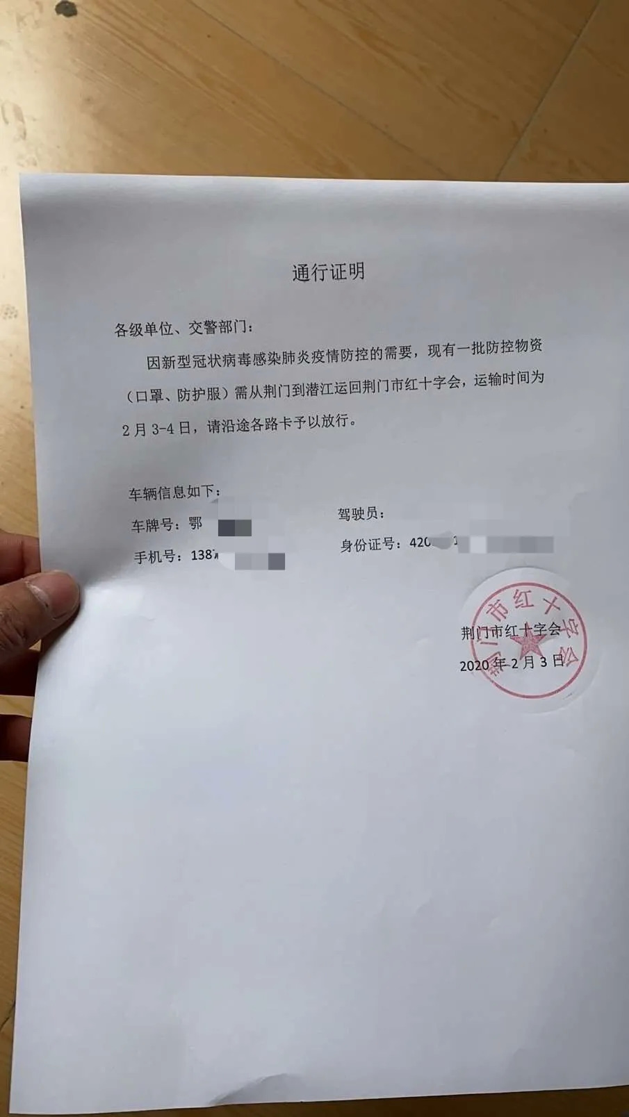 1月30日,陈志军拿到荆门市红十字会开具的电子通行证后,踏上了前往潜江市取送物资的路程。