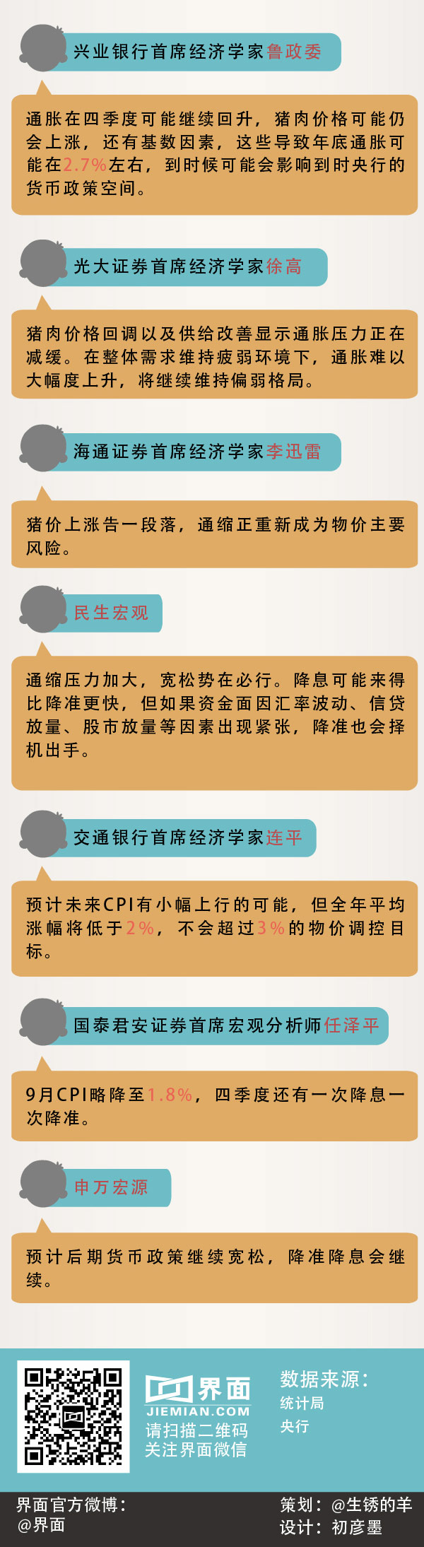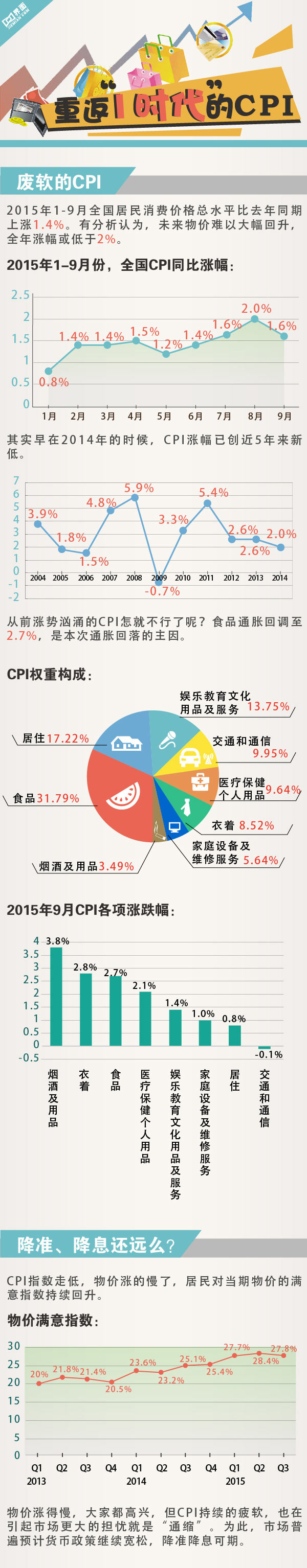 2015年1-9月全国居民消费价格总水平(CPI)比去年同期上涨1.4%;9月CPI同比增速从8月的2%下滑至1.6%,重返“1时代”。有分析认为,未来物价难以大幅回升,全年涨幅或低于2%。