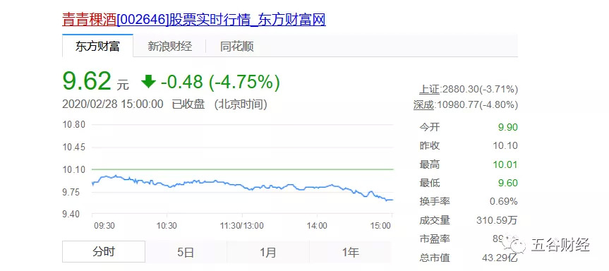 2月27日晚间,青青稞酒公开了2019年业绩快报,收入、净利纷纷下滑,尤其是净利降幅在六成以上,因此,2月28日,青青稞酒应声下跌,截止收盘,股价跌幅在4.75%左右。
