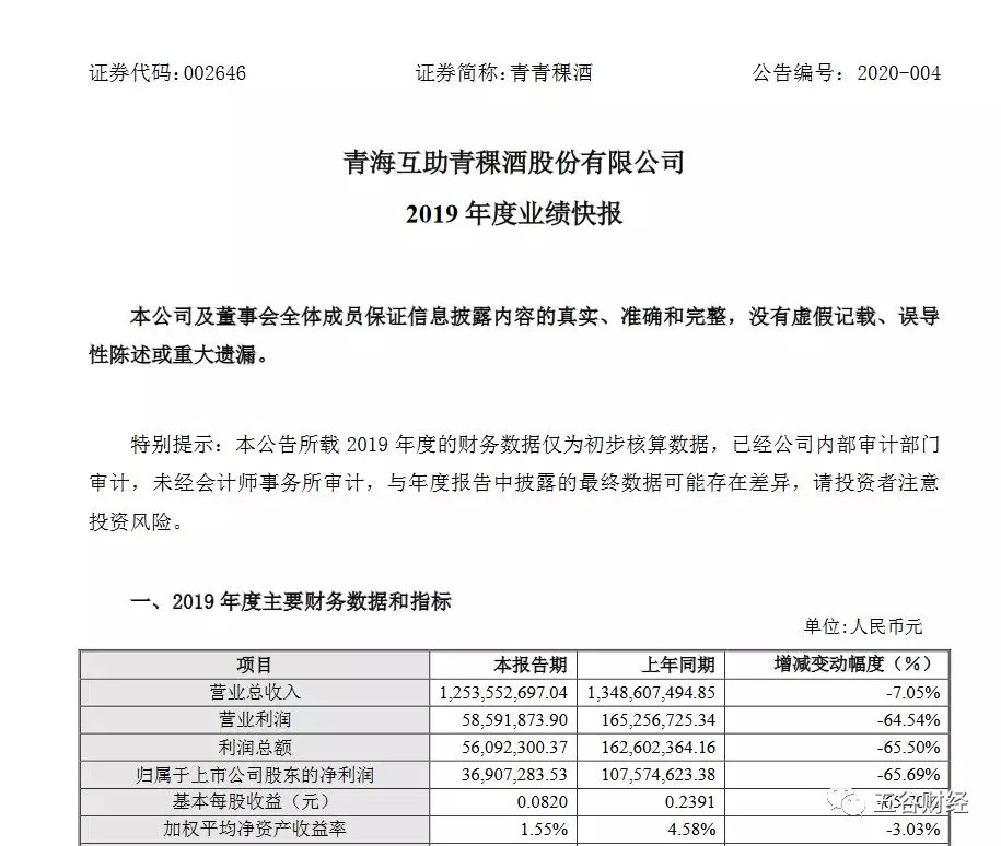 公告显示,2019年,青青稞酒营业总收入接近12.54亿元,与去年同期13.49亿元相比,降幅在7%以上;归属于上市公司股东的净利润约为3691万元,相较于2018年1.08亿元,降幅在66%左右。