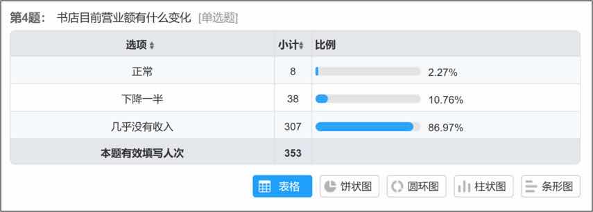 “从整个图书行业看,出版社损失较小,线上书店损失较大,实体书店损失最大。”黄平认为。中小书店联盟“书萌”主持了一项2020年春节实体书店紧急调查,调查报告反映了中小型民营书店在当下疫情当中的情况,在全国353份有效问卷当中,86.97%的书店目前几乎没有收入来源,如果疫情继续,34.56%的书店只能维持一个月不到,甚至有的书店已经在进行结业的操作,另外有四成的书店称撑不到三个月。