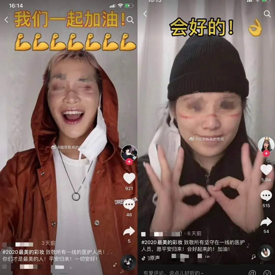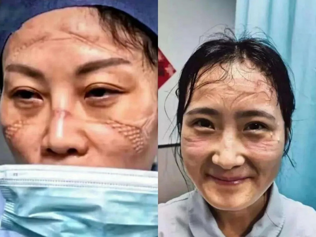 因为长时间穿戴防护服,医护们脸上会留下一条条起起伏伏的痕迹,这是她们勇敢坚毅的象征,但到了不择手段的网红们这里,则被视作一个有利可图的热点。