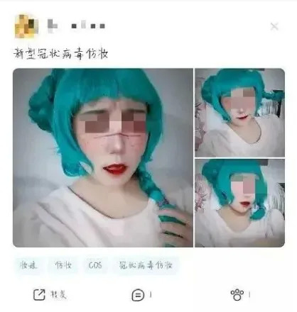 也许是这种方式还不够猎奇,有心者画风一变,丧心病狂地开始仿妆新型冠状病毒,还给病毒整了个拟人化姿态,各种美化这个夺走2800多人生命的“病毒”。