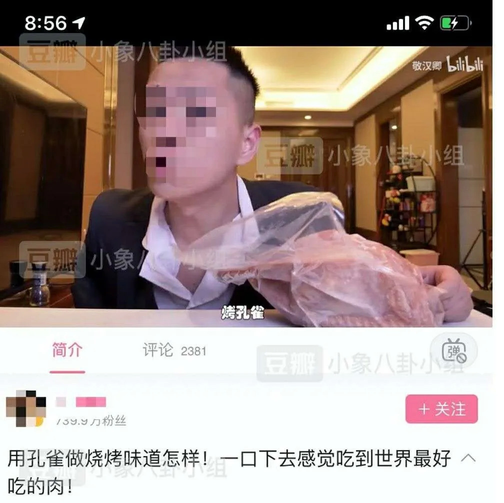 讽刺的是,这并非个例。在国家开始启动全面禁食野生动物的立法后,有吃播博主耍起小聪明,在视频里全程表演吃孔雀肉,并大言不惭地说出:“一口下去感觉吃到世界最好吃的肉。”