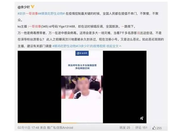 众所周知,新型冠状肺炎是由吃野味引起的,其中的利害关系已得到广泛科普,在这个时候顶风作案,不单是对自身的不负责任,更是对公知的故意践踏,但为了上位,万事皆可抛的网红们根本不care。