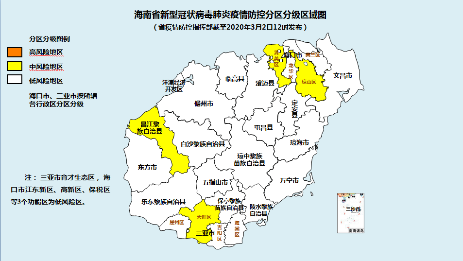 根据海南《关于实行分区分级精准防控、统筹疫情防控与经济社会秩序恢复的指导意见》要求,结合地区疫情实际情况。截至3月2日12时,按县域单元(其中海口市、三亚市以所辖各行政区为单元),海南省中风险地区4个,低风险地区22个,经指挥部评估确认,新增澄迈县为新冠肺炎疫情低风险地区。