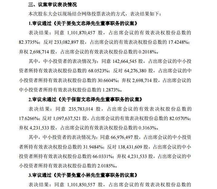 在大会上,经过表决,罢免了文忠泽和董小林的董事职位,同时修改了相关章程,奋达科技的董事会席位由原本的9席变更为7席。