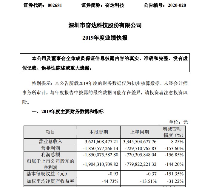 2月29日,奋达科技发布了2019年业绩快报,实现营业收入为36.22亿元,较2018年33.46亿元增长8.25%;实现归属股东的净亏损19.04亿元,较2018年亏损7.20亿元相比扩大144.20%。