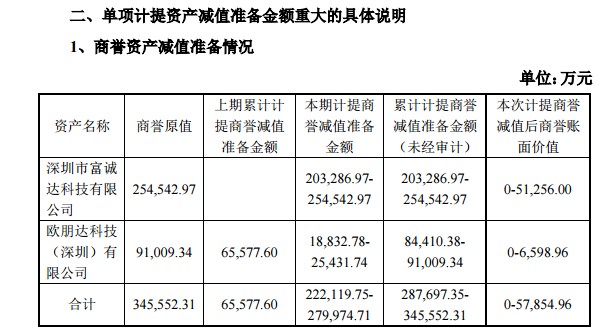 关于2019年亏损扩大,奋达科技解释称,对合并深圳市富诚达科技有限公司(下称“富诚达”)、欧朋达科技(深圳)有限公司(下称“欧朋达”)形成的商誉计提减值、存货及固定资产计提减值所致。若剔除商誉减值等因素,预计2019年度归属于上市公司股东的净利润为正值。