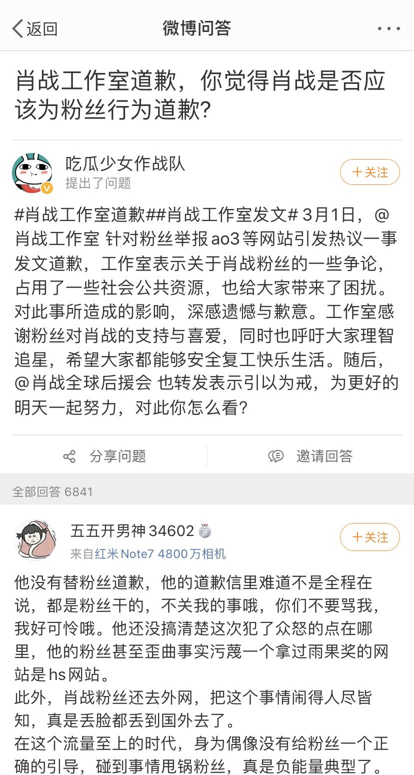 虽然道歉来得算及时,但公众并不买单。在微博问答《肖战工作室道歉,你觉得肖战是否应该为粉丝行为道歉?》的问题下,最高赞的回答中写道,“在这个流量至上的时代,身为偶像没有给粉丝一个正确的引导,碰到事情甩锅粉丝,真是负能量典型了”。