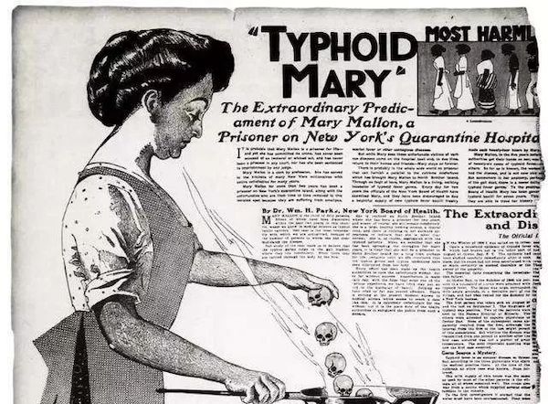 无疑史上最有名的伤寒带菌者就是“伤寒玛丽”,也就是1869年9月23日出生于爱尔兰蒂龙郡库克斯顿(Cookstown)的玛丽·马伦(Mary Mallon)。这位高大结实的金发女孩,14岁就搬到纽约市当厨师。她的就业记录十分糟糕,经常从一份工作跳到另一份工作。