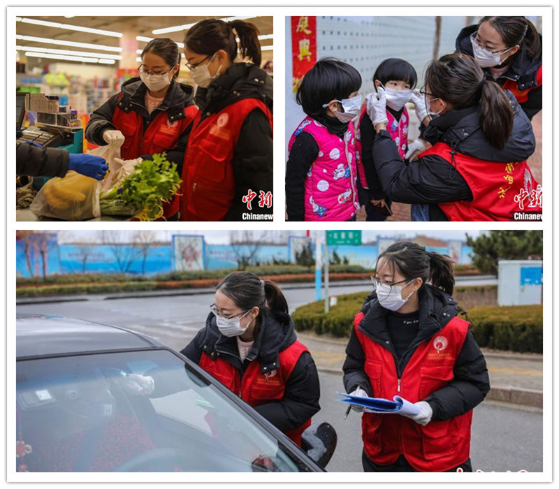 在山东省荣成市城西街道西环社区,工作人员宋伟琪和宋伟琳忙着对居民小区出入口进行设卡体温检测、登记,除此之外,他们还肩负起为社区老人“代购”生活物资、向社区居民发放口罩等工作。这对坚守在疫情防控一线的双胞胎姐妹格外引人注意。 图片来源:中新网