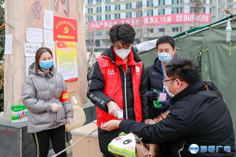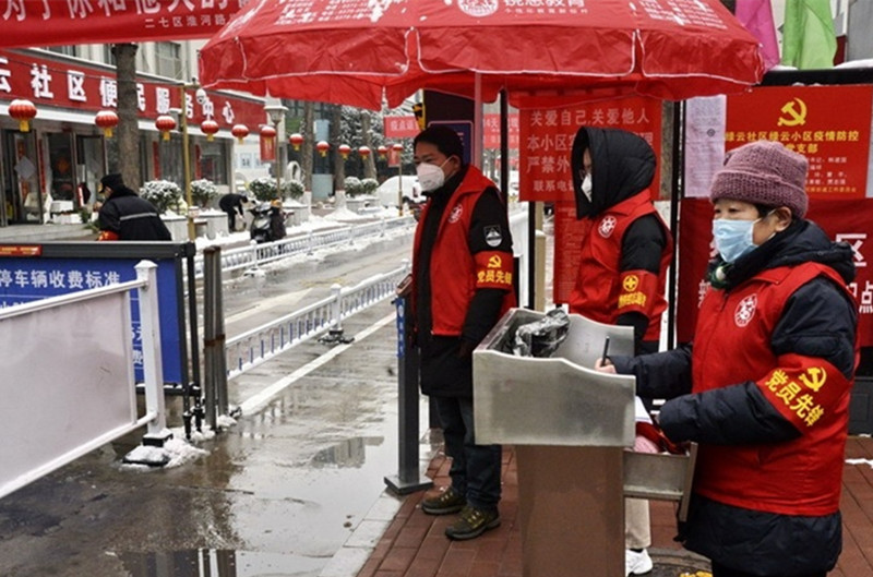 河北省邯郸市丛台区河东社区白建彬一家在社区疫情防控卡点值守 (左为妻子耿红漫、中间穿红马甲的为儿子白桓宇、右边戴工作证的为白建彬)。 图片来源:邯郸广电