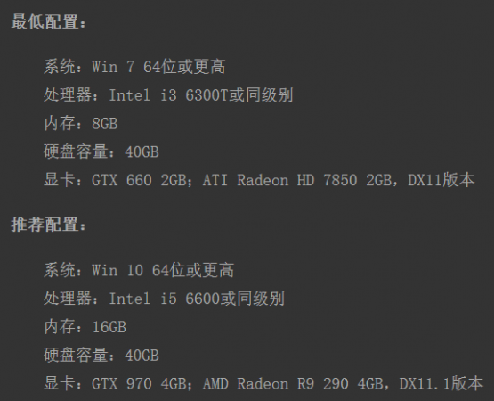 从官方给出的配置来看,游戏的门槛还是比较高的。低配运行的8G内存、GTX660显卡已经让不少玩家望而却步,推荐配置的要求更是高的吓人。不过从游戏的画面精致程度来看,如此要求也在情理之中。