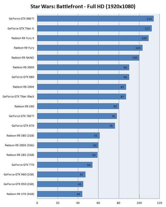 从图中可以看出NVIDIA的GTX980ti以114帧稳居榜首,但随后包揽2-6名的显卡均来自老对手AMD。在中档显卡方面,AMD的R9380显卡与同等价位的GTX960拉开了15帧的差距。在这场DX11的较量中,AMD显然占了上风。虽然我们不得不承认,这跟《星球大战:前线》所用的寒霜3引擎与AMD合作有不少关系,但是EA对此已经表示过,没有什么负优化之类的事情存在。