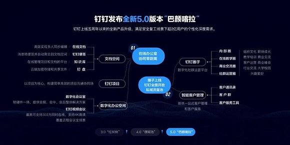 2月25日,钉钉CEO陈航在直播中发布了产品的5.0升级版。疫情时期发布的新版本里,钉钉通过在线办公室完善工具和群的连接,并试图用圈子实现多群运营,以形成便于集中管理的私域流量池。