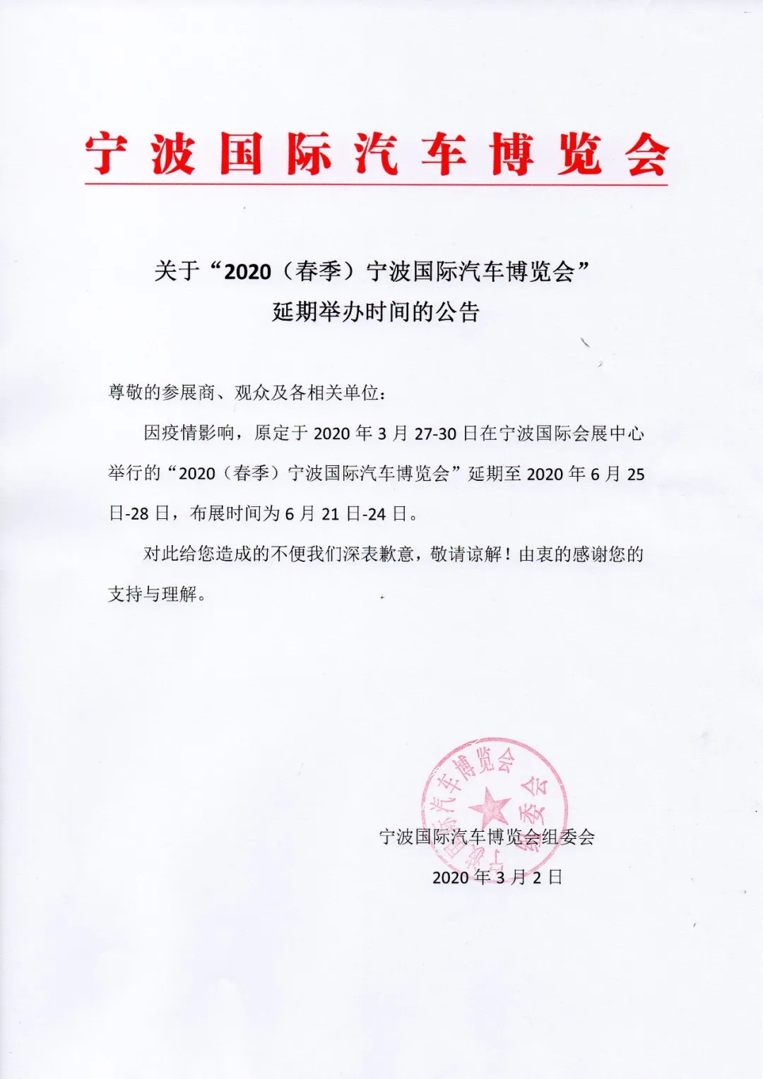 因疫情影响,原定于2020年3月27-30日在宁波国际会展中心举行的“2020(春季)宁波国际汽车博览会”延期至2020年6月25-28日,布展时间为6月21-24日。