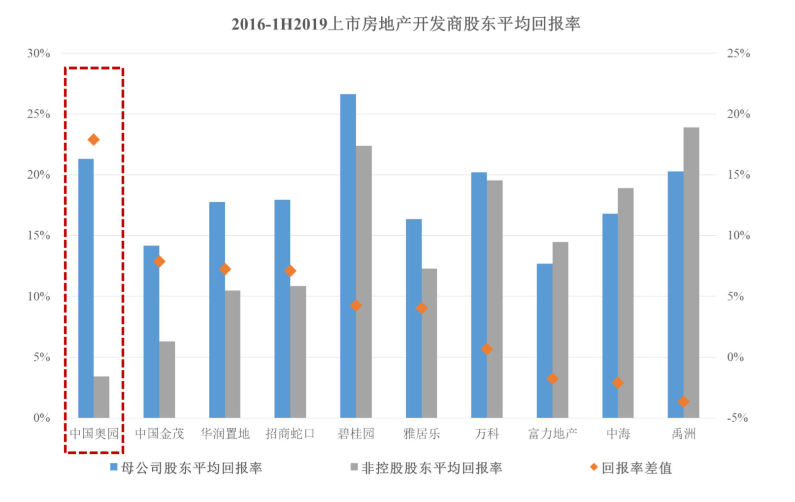 报告指出,过去三年半里,奥园非控股股东以3.4%的平均投资回报率在同行业中垫底,同时和母公司股东超过20%的投资回报率形成明显差距,这并不是正常的收入结转或者项目投资所能解释的。