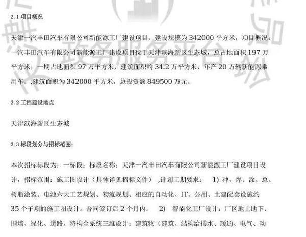近日,据网上流传的一份疑似天津生态城发布的文件显示,丰田汽车将在天津投资85亿元新建一座电动车工厂,年产能20万辆。