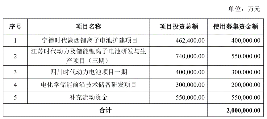 2月26日,宁德时代发布公告称,拟非公开发行股票募集资金不超过200亿元,将全部用于产能扩建、前沿技术研发和补充流动资金,金额分别为125亿元、20亿元以及55亿元。截至目前,宁德时代此次非公开发行是再融资新规以来,募集金额最大的一次预案。