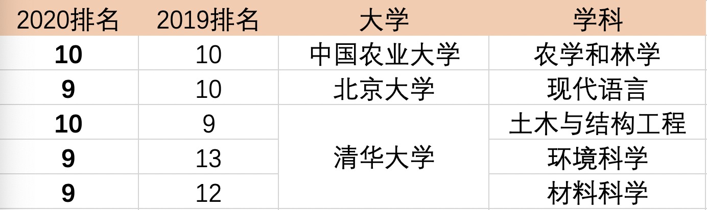 在今年的榜单中,中国共有5个学科进入世界10强,较去年增加1个。清华大学的材料学、环境科学、土木与结构工程专业均排名世界前十,北京大学的现代语言学专业以及中国农业大学的农业与林业专业也位于前十行列。