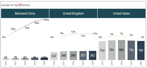 全球范围来看,美国拥有30个世界排名第一的学科,英国有13个,荷兰和瑞士各2个,加拿大1个。值得注意的是,美国大学世界50强的学科数量在过去两年间持续减少,从2018年的806个减少至2020年的769个。