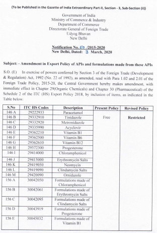 印度对外贸易总局(DGFT)发布通知称,从3月3日起立即对扑热息痛、红霉素盐、维生素B12和黄体酮等关键药物成分实施限制。生产厂商需要获得无异议证书(NOC)才能继续出口至其他国家。