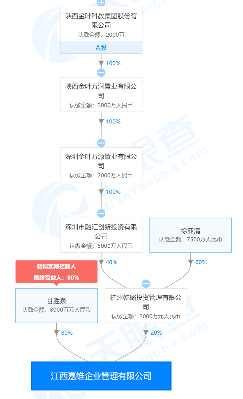 江西嘉维成立时间为2019年6月19日,注册资本1亿元。天眼查显示,甘胜泉持股80%,杭州乾璐投资管理有限公司(下称乾璐投资)持股20%,而乾璐投资又是由徐亚清持股60%,由深圳市融汇创新投资有限公司持股40%。再往上追溯,深圳市融汇创新投资有限公司又是由上市公司陕西金叶(000812.SZ)100%持有。