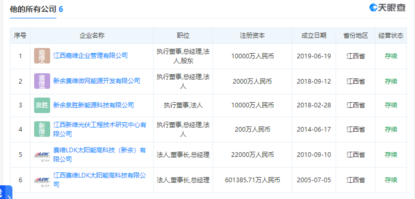 这甘胜泉的来头也不小,除了江西嘉维股权之外,还是新余赛维微网能源开发有限公司的执行董事、总经理、法人;新余泉胜新能源科技有限公司的执行董事、法人;江西新维光伏工程技术研究中心有限公司的执行董事、总经理、法人;赛维LDK太阳能高科技(新余)有限公司的法人、董事长、总经理;江西赛维LDK太阳能高科技有限公司(下称江西赛维LDK)的法人、董事长、总经理。