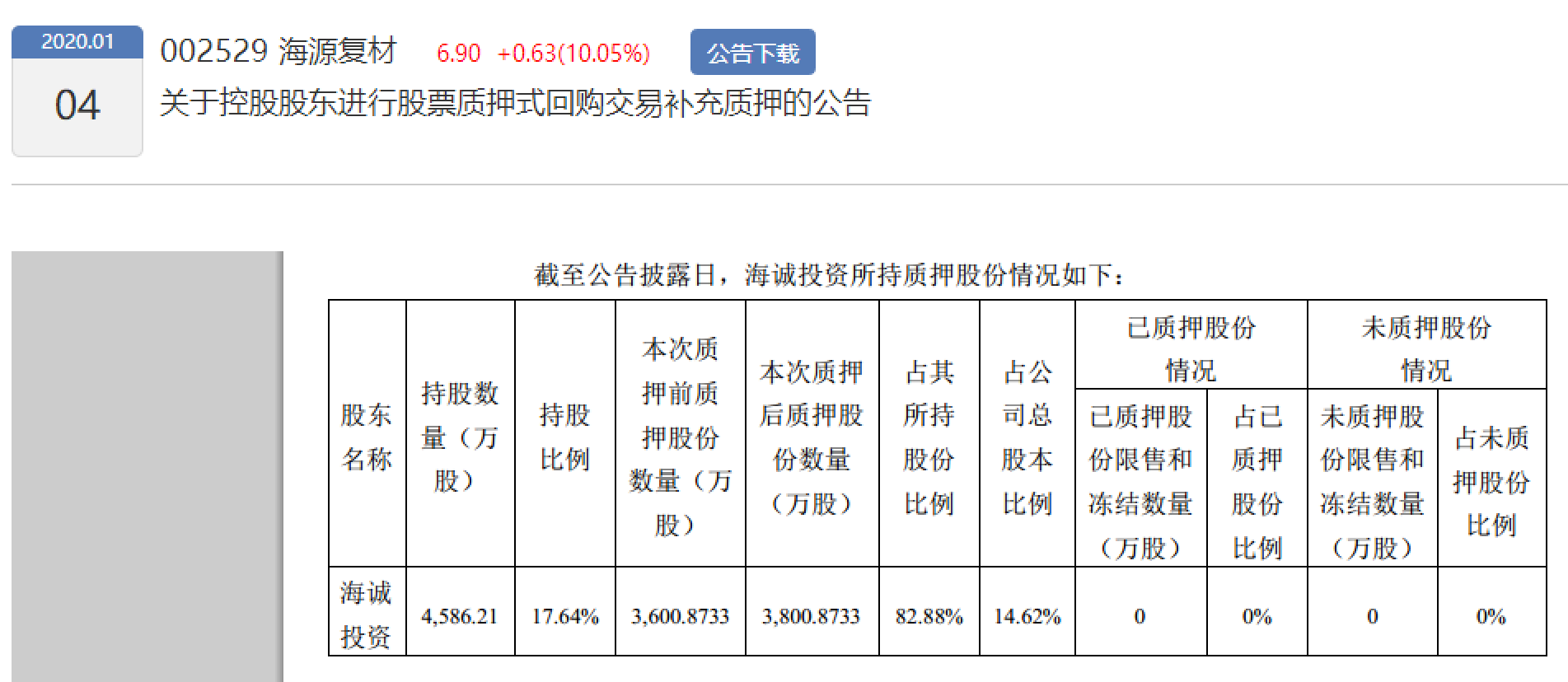 另外,截至1月4日的数据显示,海诚投资共计质押了3800.8733万股海源复材,超过其持股比例的8成。