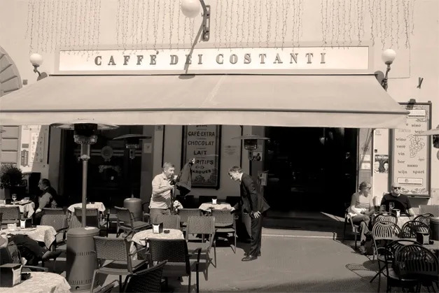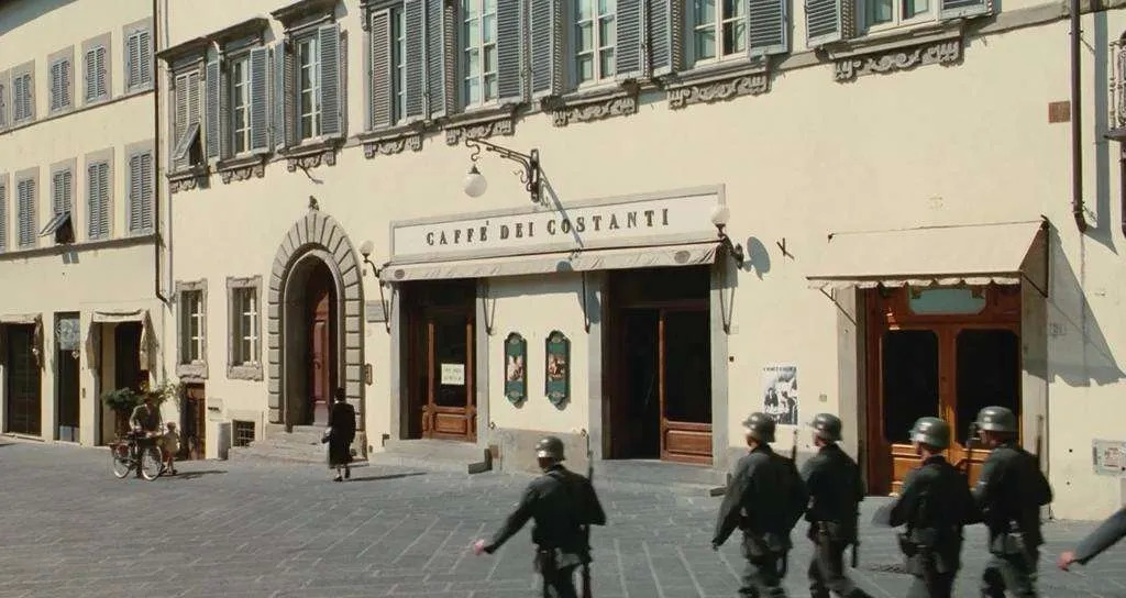 电影里剧情的重要转折之一:父子二人在清静的街头偶遇德军,让人无形中感觉到美好生活正在被悄然打破。这个场景的背景正是阿雷佐圣弗朗西斯科广场旁咖啡馆Caffe' Dei Costanti。