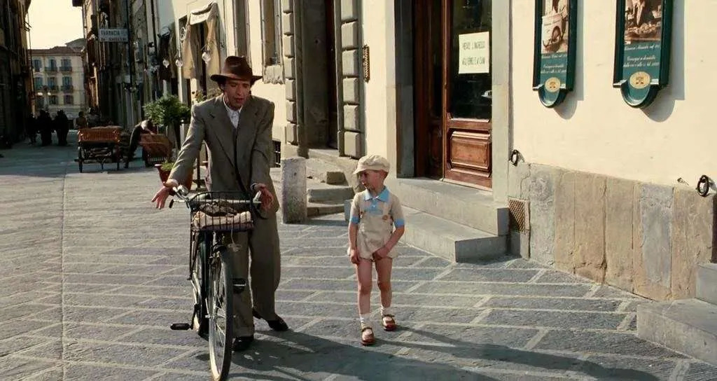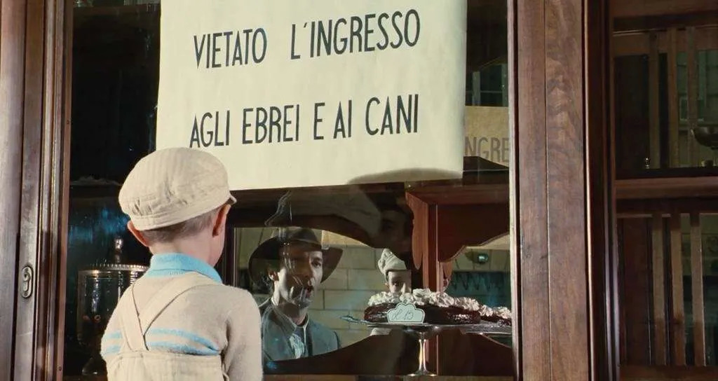 剧中:二战爆发后,阿雷佐街上的咖啡馆张贴出“犹太人与狗不得入内”的告示。儿子问父亲什么意思,父亲Guido用幽默化解了对犹太人的歧视。