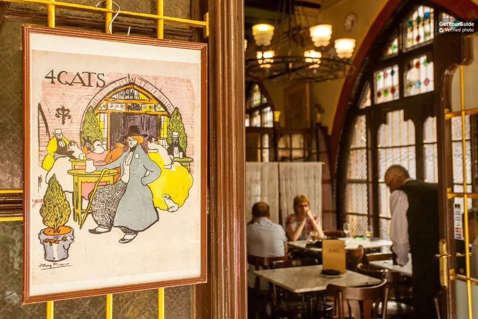 19世纪时,这里成为了西班牙艺术家们聚集在一起谈天说地的场所,曾是巴塞罗那现代主义运动的主要中心之一。1900年,19岁的毕加索还在这里举办了他的首次个展。因此,四只猫咖啡馆也被称为毕加索的起点。毕加索帮咖啡馆制作了第一份菜单。如今这幅画仍然挂在这间咖啡馆的大门上,成为了餐厅菜单的封面,延续至今。