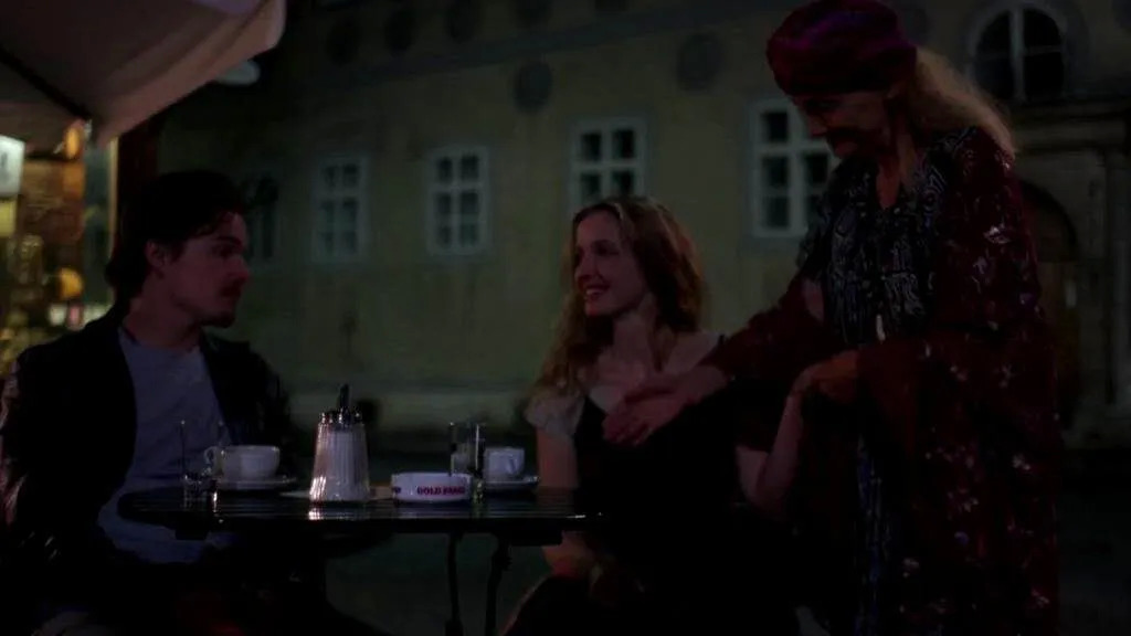 在电影里,赛琳和杰西在Kleines café 前的小广场上喝咖啡时,遇到一位算命老大太要帮他们占卜,说这世间万物都是星辰。从这里开始,两人的话题开始走向哲学,神秘和未知。