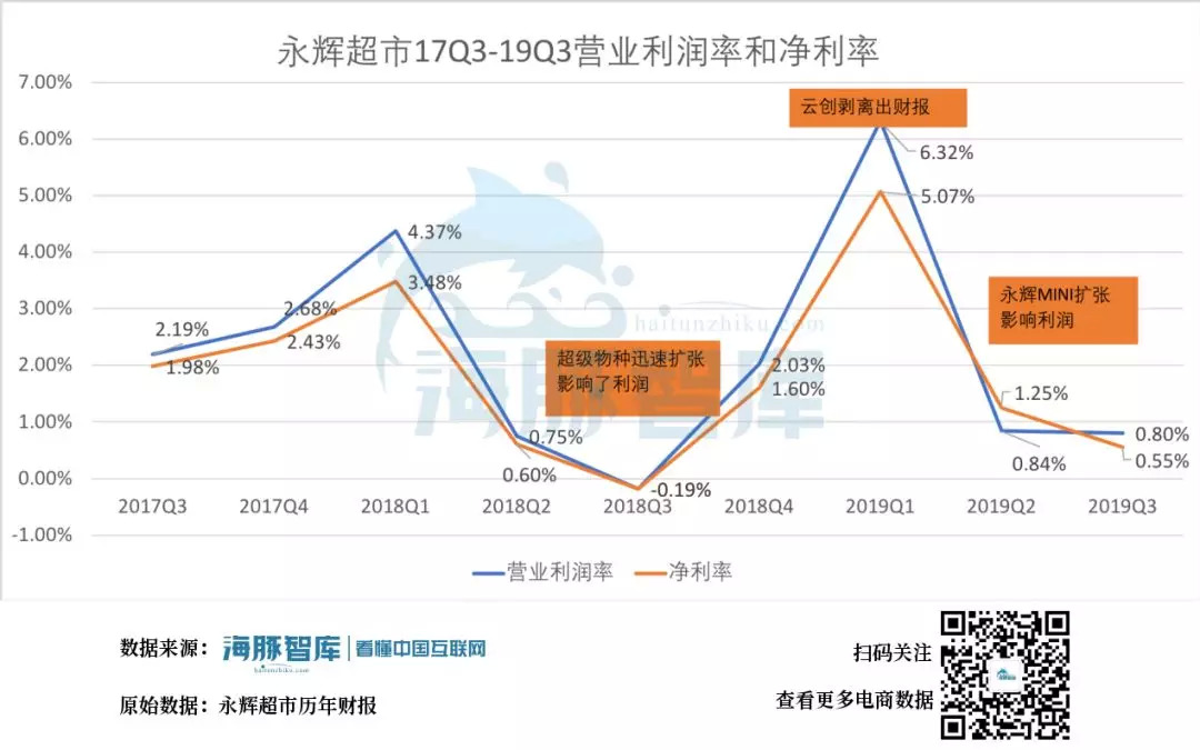 永辉超市17Q3-19Q3营业利润率和净利率。数据来源:永辉超市历年财报 海豚智库整理