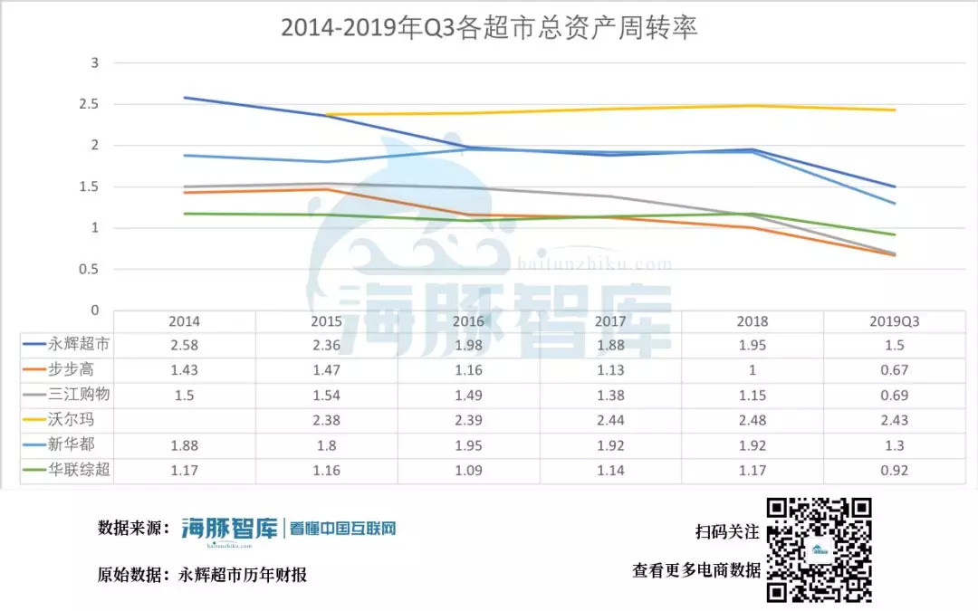 永辉超市2014年-19年Q3总资产收益率。数据来源:永辉超市历年财报 海豚智库整理