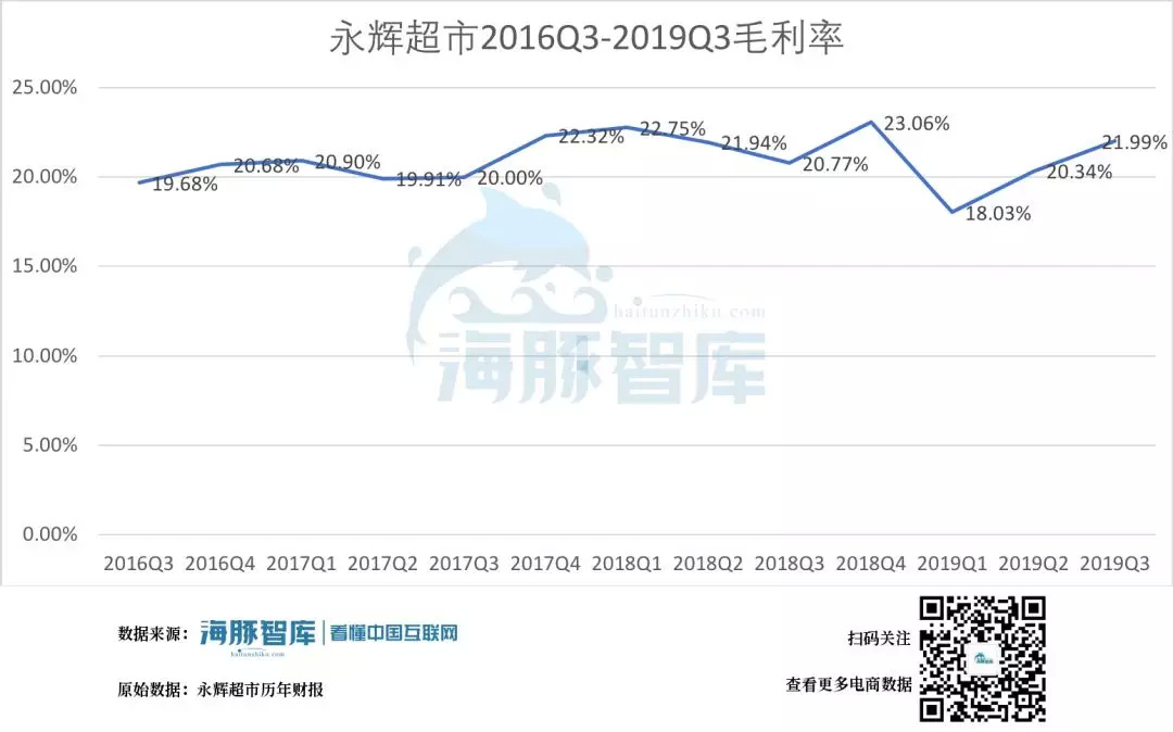 永辉超市16Q3-19Q3毛利率。数据来源:永辉超市历年财报 海豚智库整理