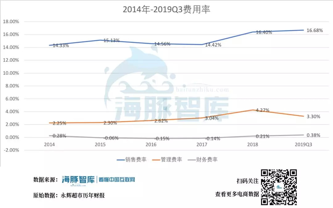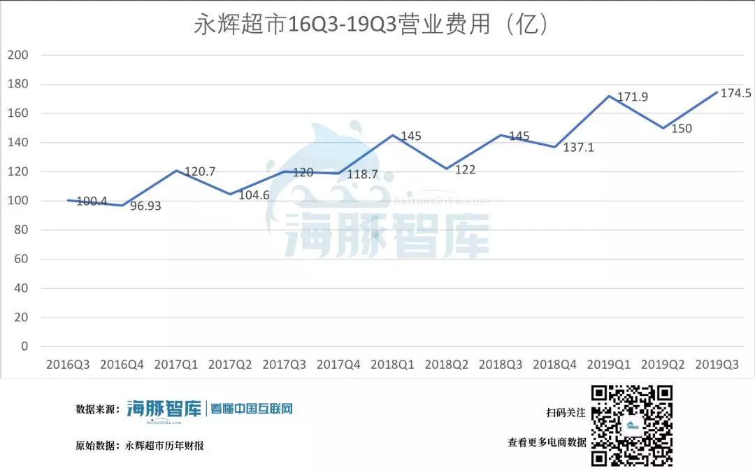 永辉超市17Q3-19Q3营业费用。数据来源:永辉超市历年财报 海豚智库整理