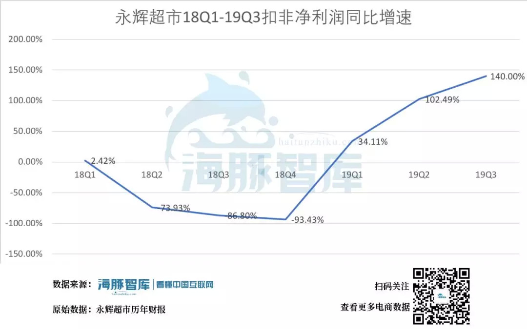 永辉超市19Q1-19Q3扣非净利润同比增速。数据来源:永辉超市历年财报 海豚智库整理
