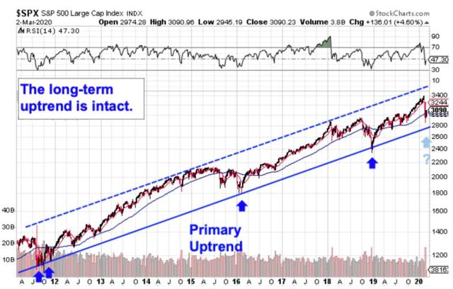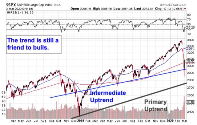 对最近的股市抛售的解释是,2020年没有收益增长。如果假设确实如此,并使用2019年标准普尔500的收益157.15美元来计算,则标准普尔500指数目前的PE为19.1。然而,但在2月份标准500指数跌至2855的低点时,当时的PE为18.2,这其实比历史平均水平是要低的。