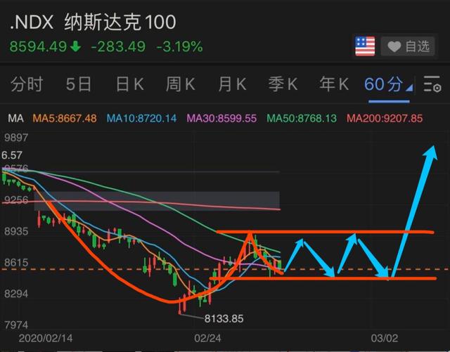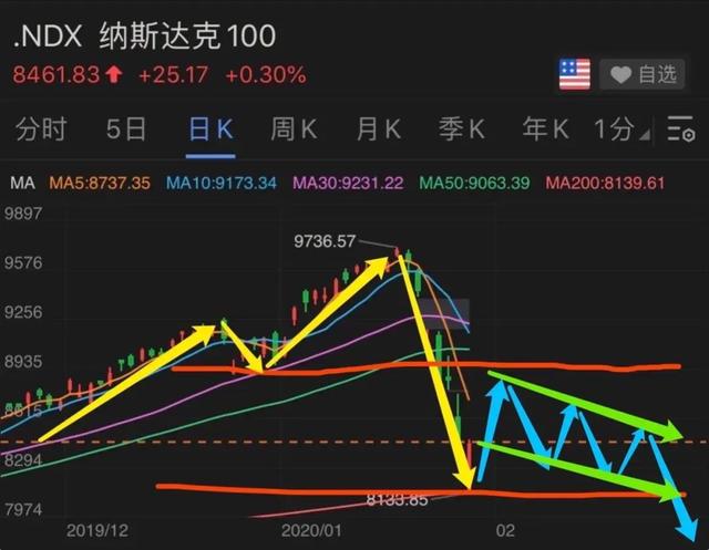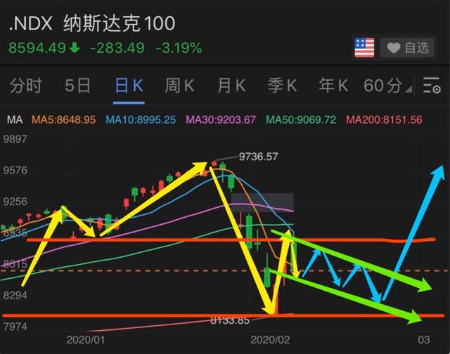 周末的时候,我画了一张图,估计很多人都印象深刻,到目前为止也都是按照那个剧本在上演,但分歧点也就此出现了,大盘到底是震荡之后继续下探,还是震荡之后回归上升通道,这是很多人困惑的问题,而这一切的争议其实聚焦了一个问题上:上周五纳斯达克100回踩200日均线,到底是不是大盘底部了?