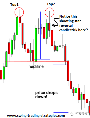 在第二个顶点形成后的下跌通常持续时间长,有时可以达到数周。如果你是用日图交易,那么抓到这波趋势,你就能盈利丰厚;