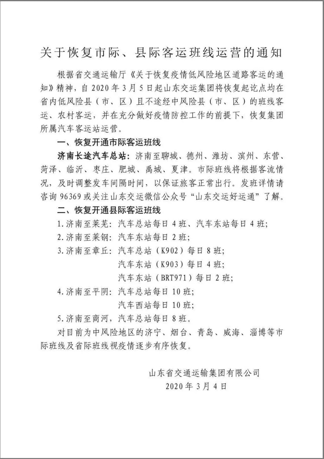 根据山东省委经济运行应急保障指挥部交通运输保障工作组《关于恢复疫情低风险地区道路客运的通知》文件精神,经上级主管部门批准,山东交运济南长途汽车总站逐步恢复低风险地区客运班线。