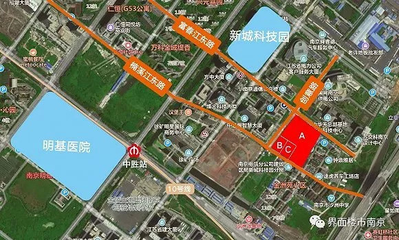 项目位于河西中部,四至为建邺区新城科技园内,北至富春江东街,南至楠溪江东街,东至康苑新村和钟鼎雅居小区,西至创意路。项目附近多为办公写字楼,住宅用地十分稀缺;临近地铁中胜站、龙湖时代上城商业体、明基医院等,生活出行就医都很便利。